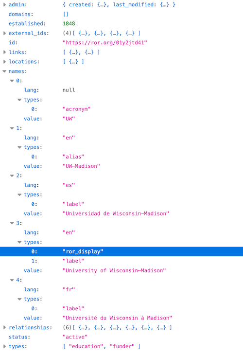 In the below example, the ROR record for the University of Wisconsin-Madison, https://ror.org/01y2jtd41, contains several values in the names field: the ror_display name "University of Wisconsin-Madison", the alias "UW-Madison", the acronym "UW", and labels for the organization's name in French and Spanish. All values are searchable.
