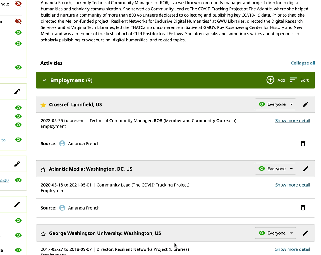 Researchers who add or update these activities in their profile will see a list of suggestions as they begin to type that come from both ROR and the Crossref Open Funder Registry. Once they select an organization and save the activity, the update will appear in the profile. Clicking "Show more detail" will reveal the identifier and metadata associated with the selected organization.
